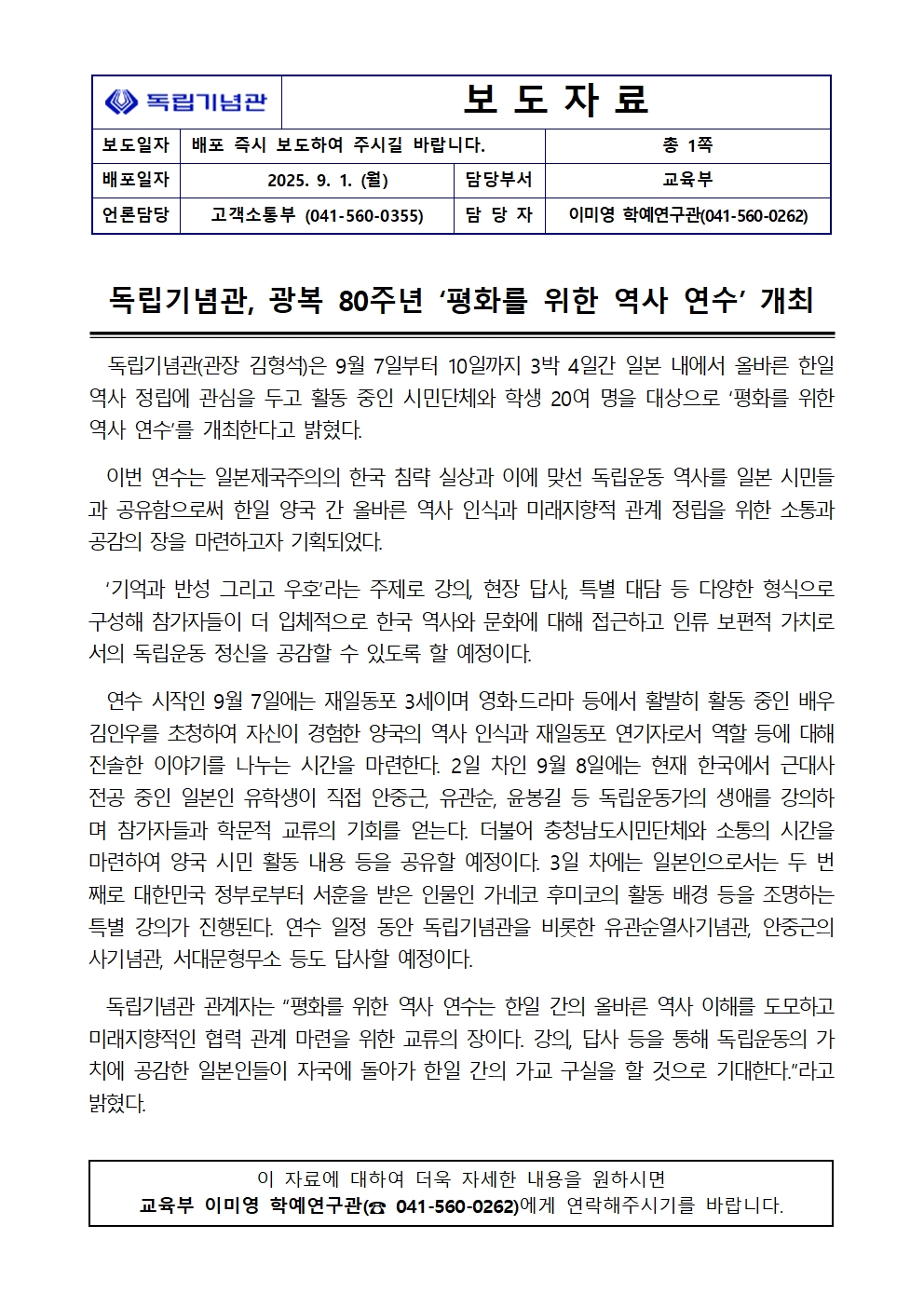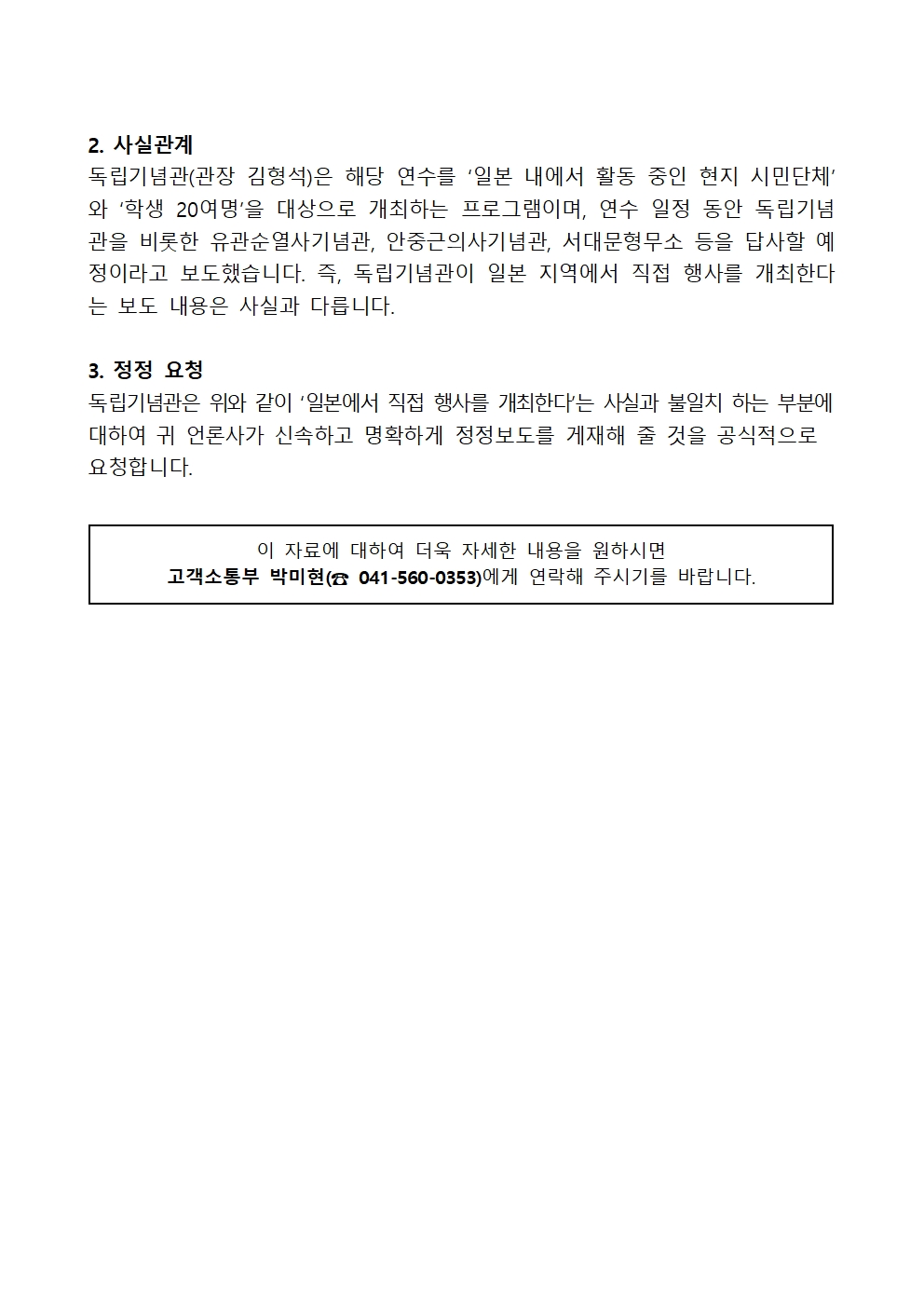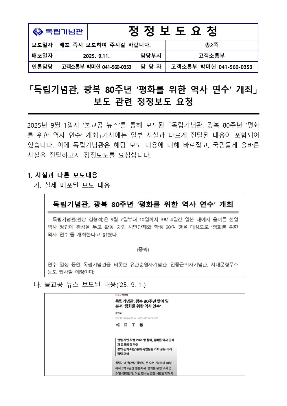 (정정보도) 「독립기념관, 광복 80주년 '평화를 위한 역사 연수'개최」보도 관련 정정보도 요청