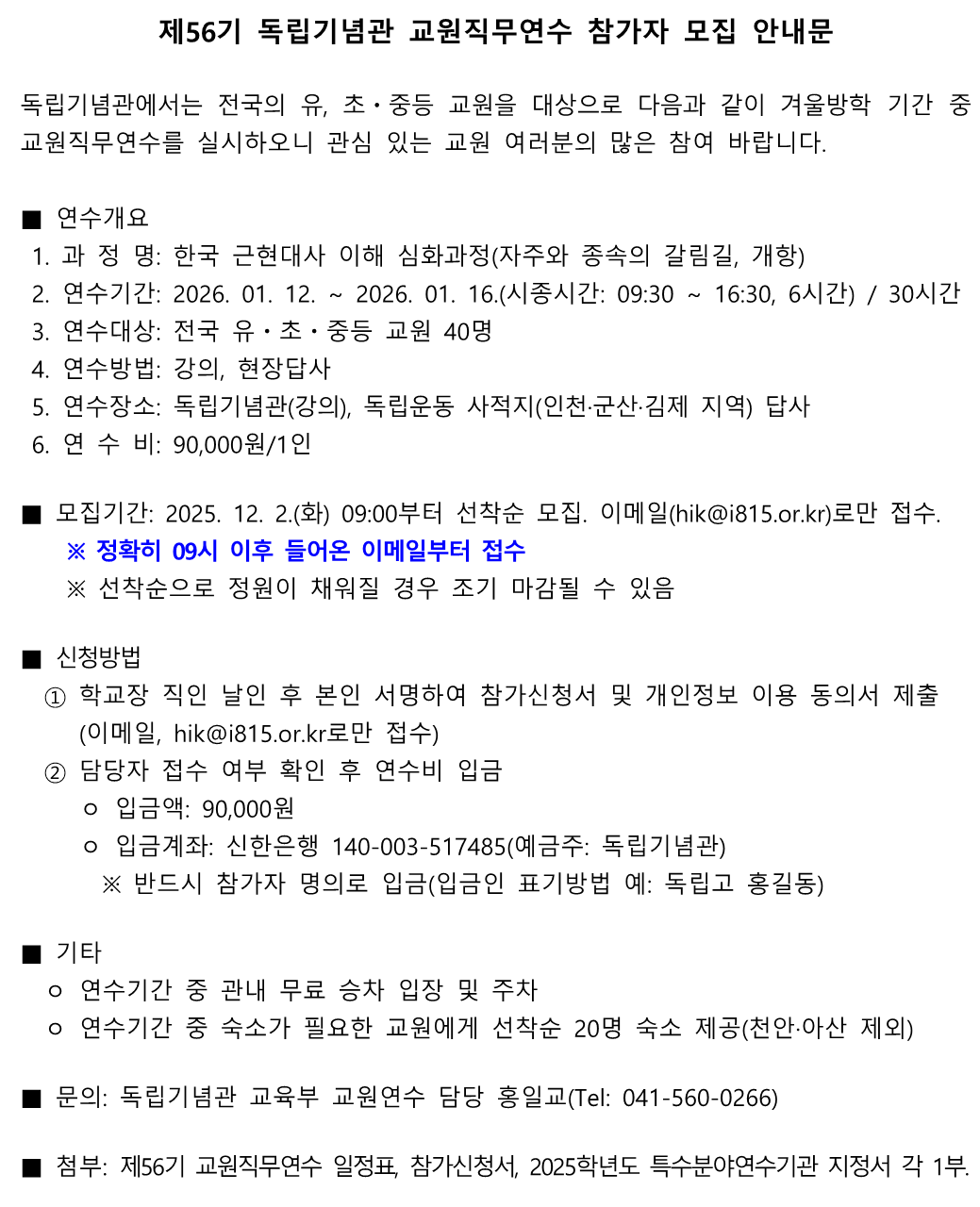제56기 독립기념관 교원직무연수 참가자 모집 안내문
