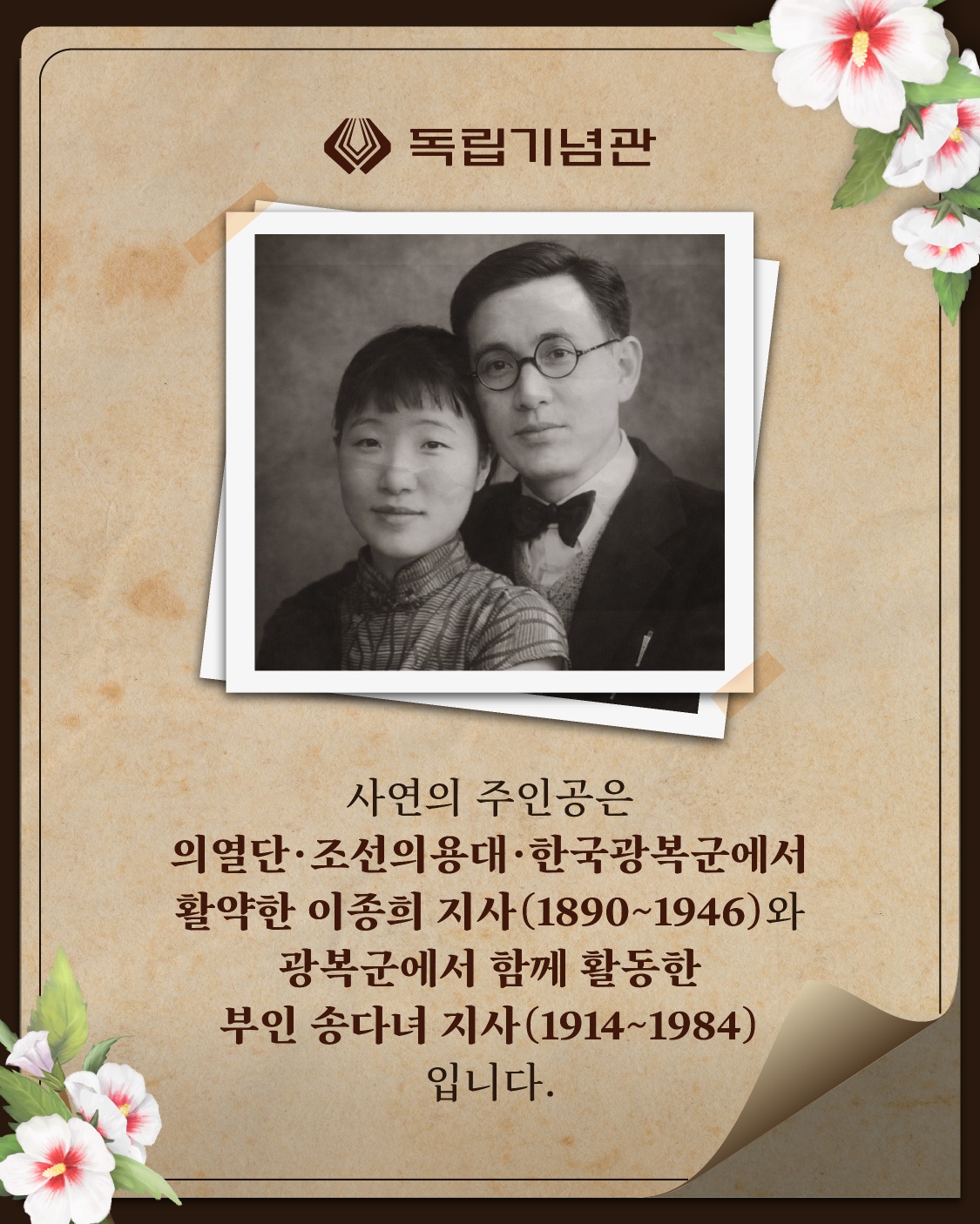사연의 주인공은 의열단·조선의용대·한국광복군에서 활약한 이종희 지사(1890~1946)와 광복군에서 함께 활동한 부인 송다녀 지사(1914~1984)입니다.
