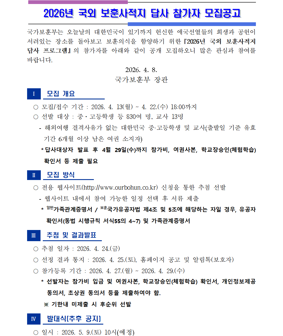 2026년 국외 보훈사적지 답사 참가자 모집 공고