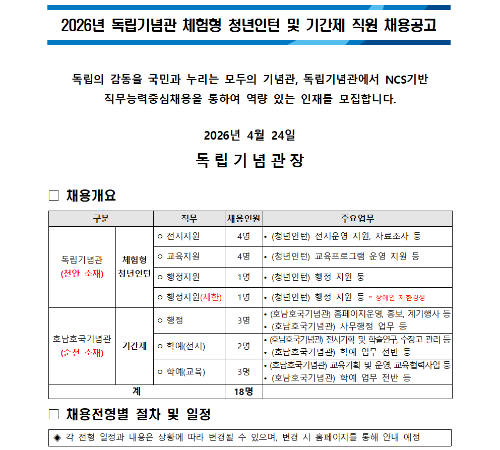 2026년 독립기념관 체험형 청년인턴 및 기간제 직원 채용 공고