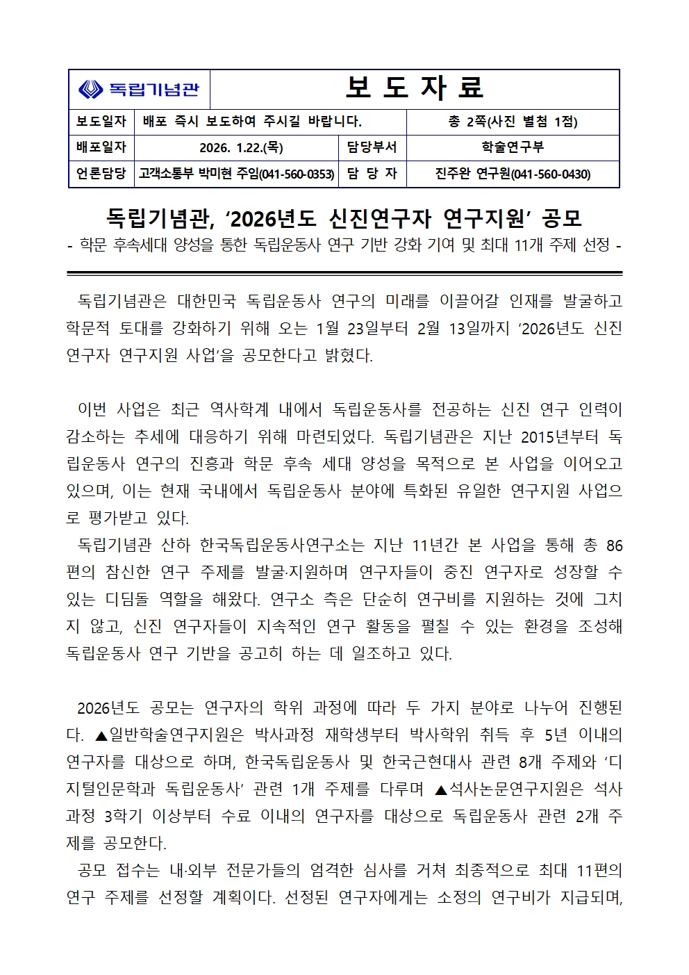 260122 독립기념관, ‘2026년도 신진연구자 연구지원’ 공모.hwp