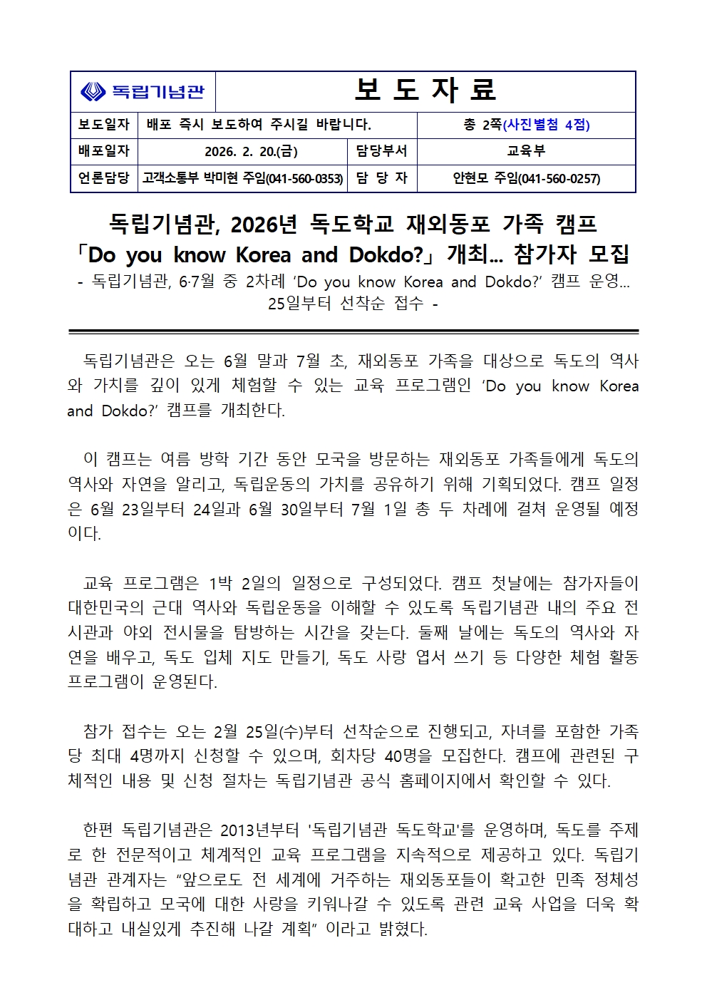 260220 독립기념관, 2026년 독도학교 재외동포 가족 캠프 「Do you know Korea and Dokdo」 개최... 참가자 모집.hwp