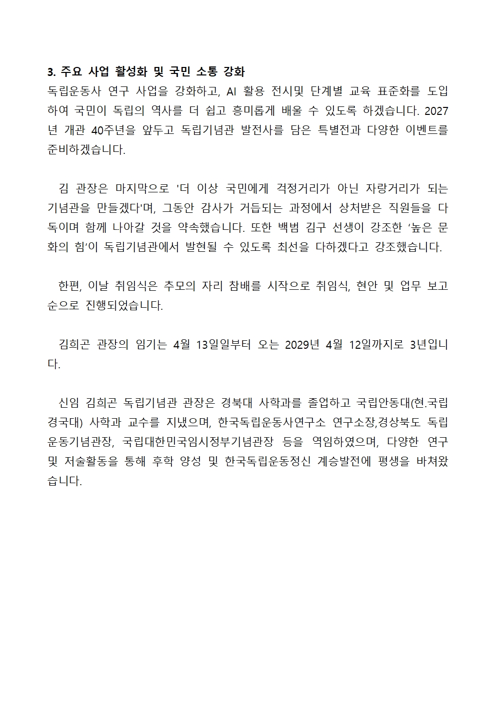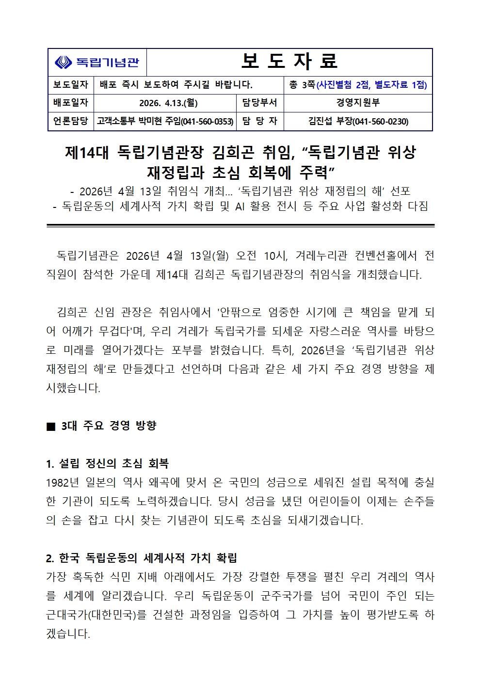 260413 제14대 독립기념관장 김희곤 취임, “독립기념관 위상 재정립과 초심 회복에 주력”.hwp